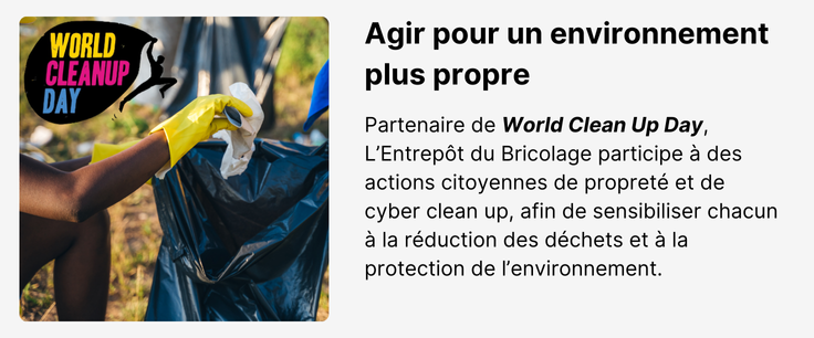 L’Entrepôt du Bricolage est une entreprise engagée, emmenée par ses collaboratrices citoyennes et ses collaborateurs citoyens vers davantage de Responsabilité Environnementale et Sociétale. Ils forment la Communauté Éthique & Empreinte, qui est intégrée au sein de la Gouvernance de l'entreprise afin d'y déployer tous ses projets d'engagement.