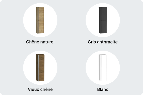 Optez pour l’une de nos 4 finitions de caissons blanc brillant, gris mat, chêne naturel ou vieux chêne, et choisissez votre poignée en noir ou en chrome pour un style qui vous ressemble.