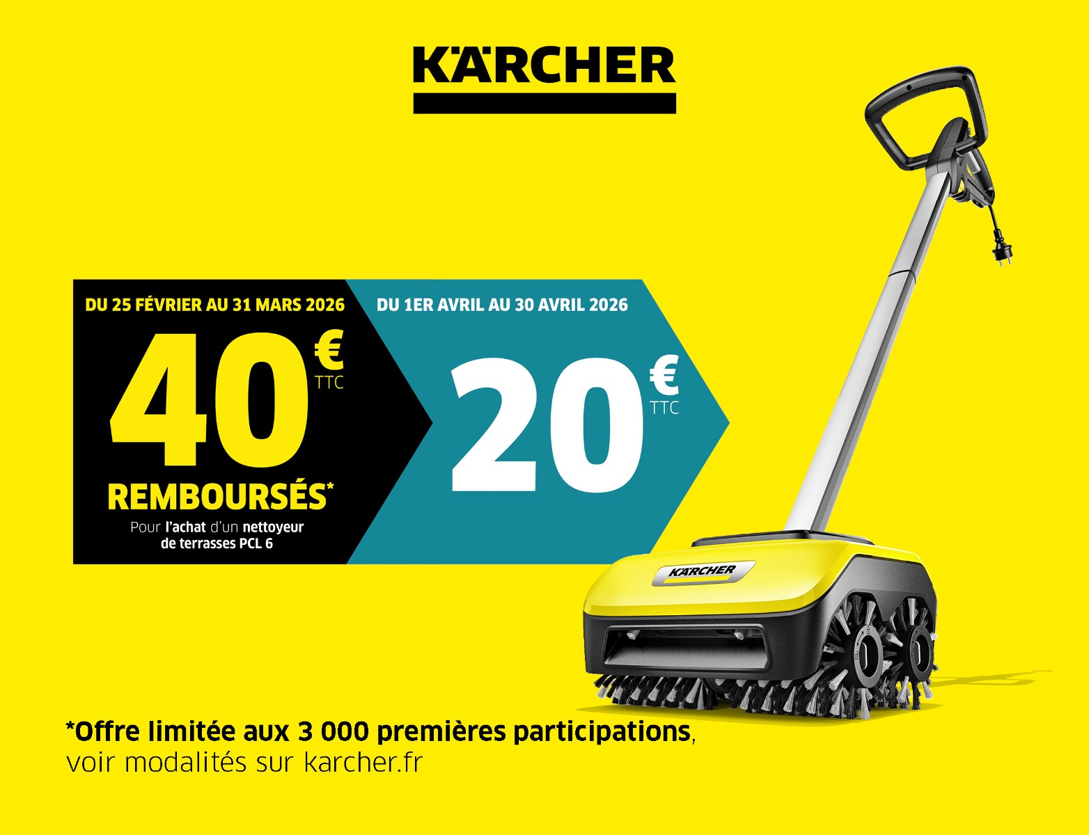 Achetez entre le 25/02/2026 et le 31/03/2026 un nettoyeur de terrasses PCL 6 pour bénéficier d'un remboursement de 40€.