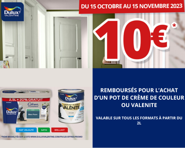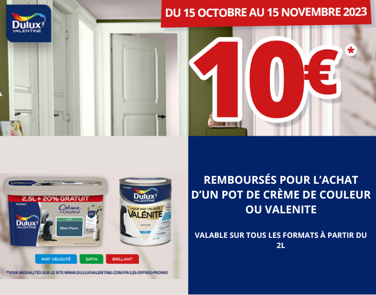 * Offre valable du 15 octobre au 15 novembre 2023 pour l’achat d’un pot de peinture Dulux Valentine Crème de Couleur ou Valénite, tous les aspects sont éligibles. Formats concernés : 2L, 2L+20% gratuit, 2.5L, 2.5L+20% gratuit, 5L, 10L. Remboursement par virement bancaire sous 4 à 8 semaines à compter de la réception de la demande complète et conforme. Offre réservée uniquement aux personnes physiques majeures domiciliées en France métropolitaine (Corse comprise) DROM COM. Offre non cumulable avec les autres opérations en cours et limitée à un seul remboursement de 10€ TTC par foyer (même nom, même adresse postale et/ou même adresse mail et/ou même adresse IP et/ou même RIB). Toute demande illisible, incomplète, non conforme ou hors délais de participation sera considérée comme nulle. Aucune demande de remboursement des frais de connexion et/ou frais postaux ne sera prise en compte.
