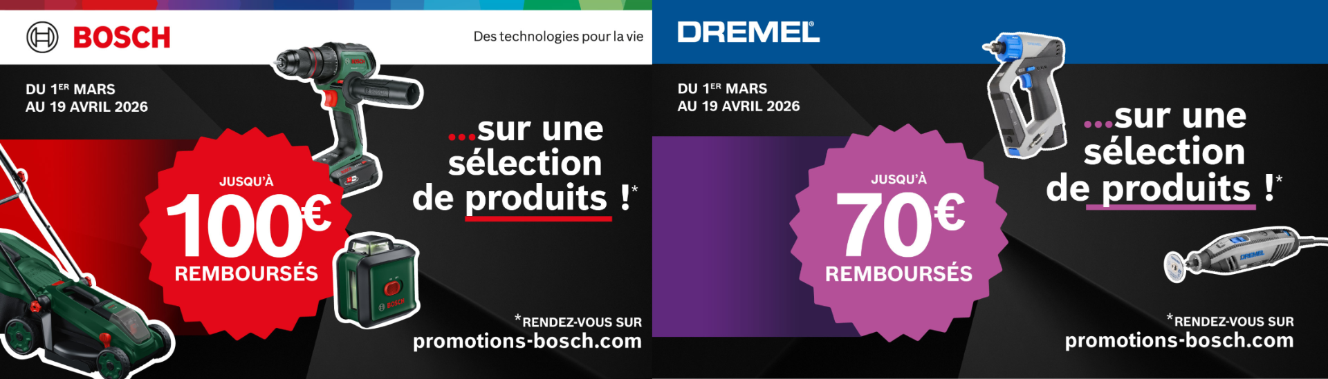 Achetez entre le 01/03/2026 et le 19/04/2026 inclus un produit Bosch parmi les références éligibles pour bénéficier d'un remboursement jusqu'à 100€ selon la référence.