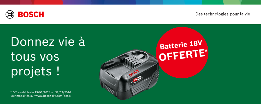 un outil 18 V version set (avec batterie et chargeur) de Bosch Home & Garden en ligne ou dans un magasin stationnaire en France Métropolitaine (Corse et Monaco inclus) ainsi que les Départements d’Outre-Mer suivants (La Réunion, la Guadeloupe, la Martinique, Mayotte et la Guyane). Veuillez noter que les produits d'occasion ou de second choix sont exclus de l'Offre promotionnelle.
