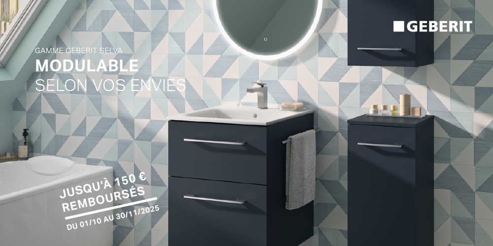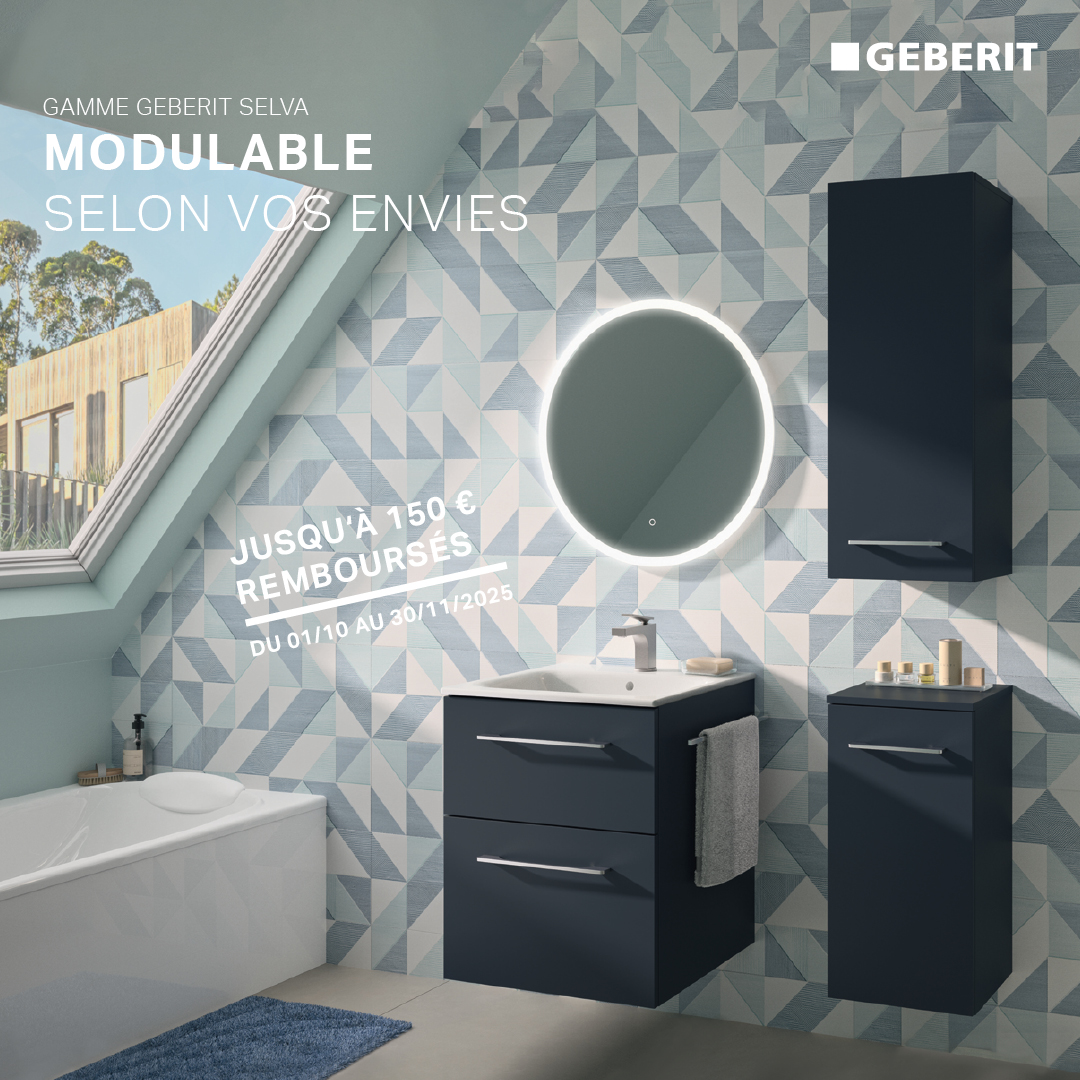 Achetez entre le 01/10/2025 et le 30/11/2025 inclus une composition de meubles Selva éligible Geberit pour bénéficier d’un remboursement jusqu’à 150€.