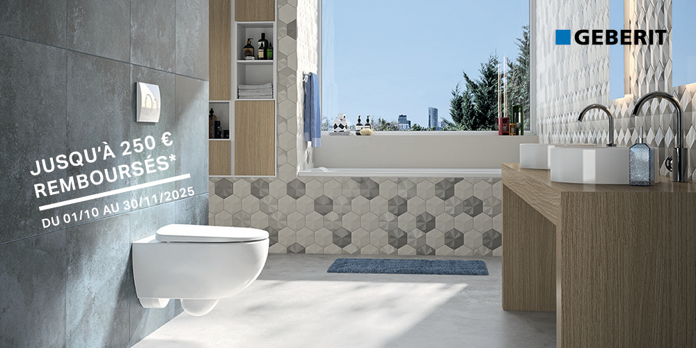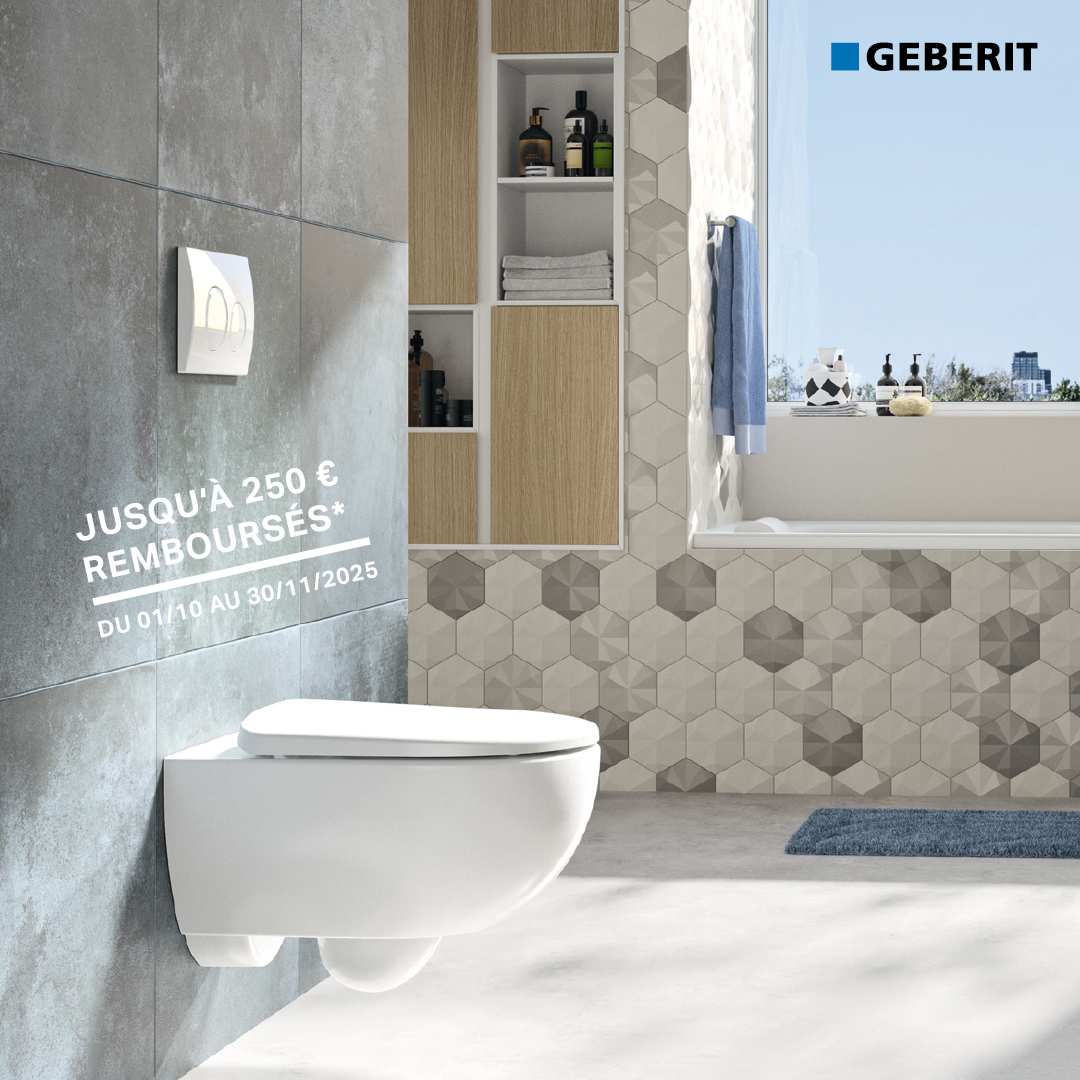 Achetez entre le 01/10/2025 et le 30/11/2025 inclus une solution WC éligible Geberit pour bénéficier d’un remboursement jusqu’à 250€.