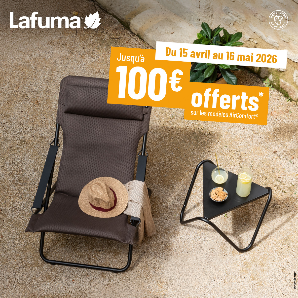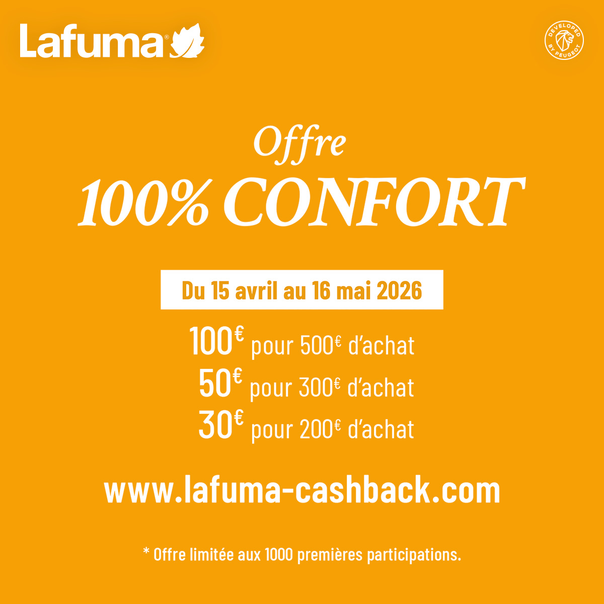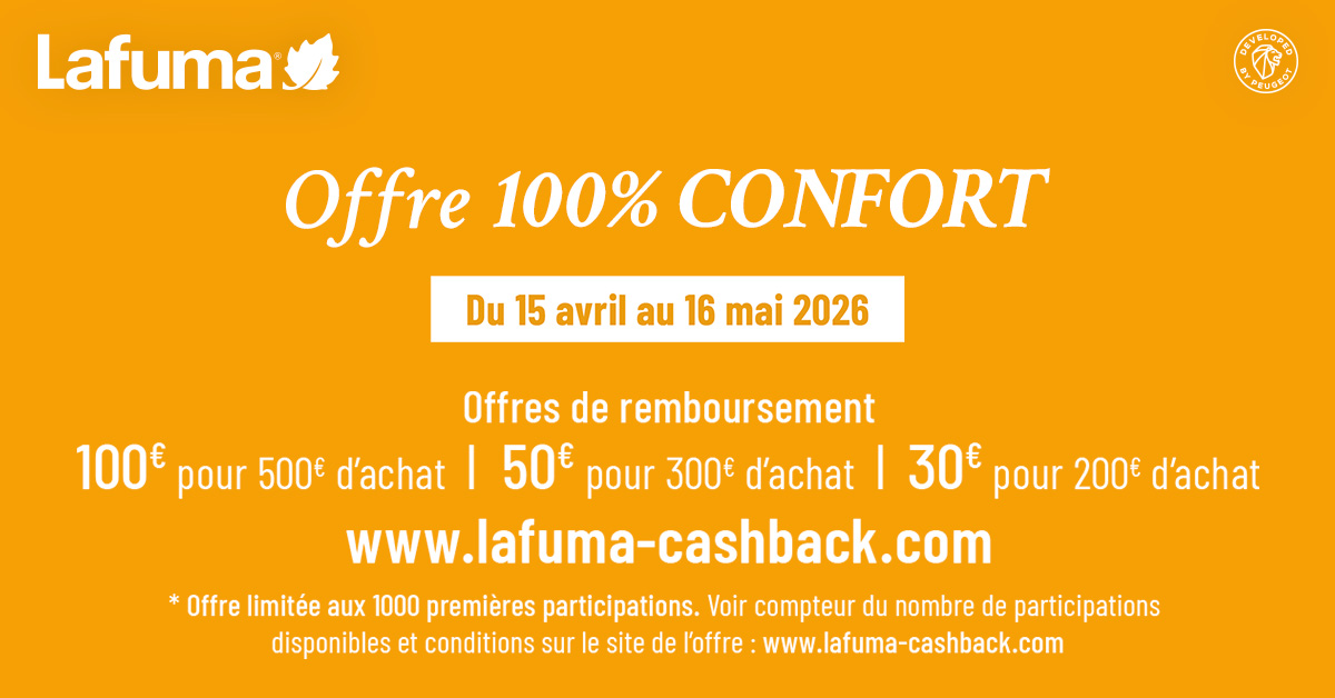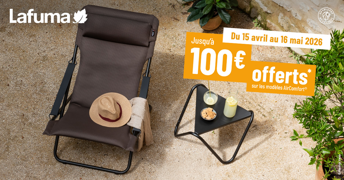 Achetez entre le 15/04/2026 et le 16/05/2026 un produit AirComfort Lafuma parmi les références éligibles pour bénéficier d'un remboursement jusqu'à 100€.