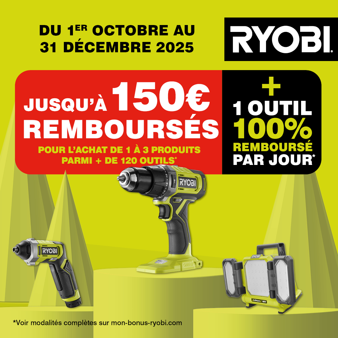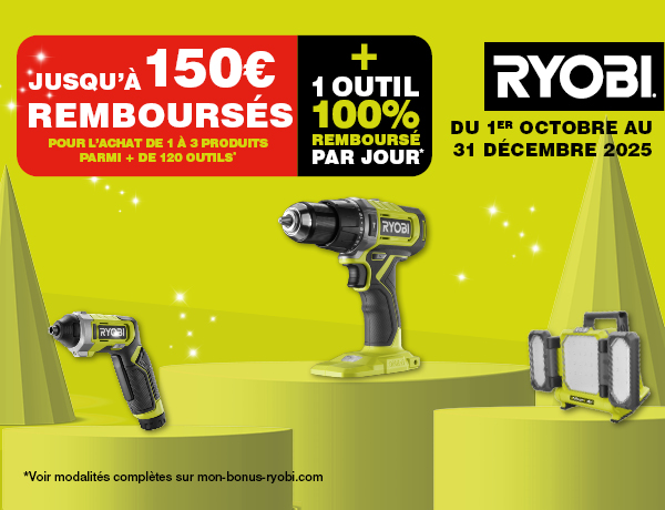 Achetez entre le 01/10/2025 et le 31/12/2025 , jusqu’à 3 outils Ryobi éligibles à l’offre pour bénéficier d’un remboursement jusqu’à 150€ ainsi qu'une chance par jour de gagner votre outil 100% remboursé*.