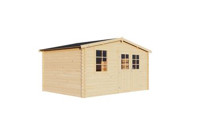 Abri Amely en épicéa non traité, toit à deux pentes, surface intérieure 10,20 m². Madriers à emboîter 34 mm. Livré sans plancher. Feutre bitumé inclus. Une porte double, une fenêtre simple, fixe en verre. Dimensions hors tout: 410,8 x 296 x 222 cm