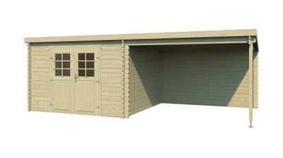Abri de jardin Elody en épicéa non traité, toit plat, surface intérieure 8,20 m² + 8,20 m² d'extension. Madriers à emboîter d'une épaisseur de 28 mm. Livré sans plancher. Feutre bitumé inclus