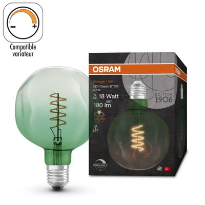 L'ampoule LED Globe E27 Vert 4,5W 180 lm Blanc chaud d'OSRAM est une ampoule au design décoratif et à la performance égale aux lampes standards.