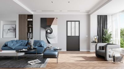 Poussant gauche, joint Phonique, 2 styles : atelier et contemporain (sans lattes verticales), Finition profils : noir et blanc sablé. Section profils : cadre de porte 36mm avec serrure montée