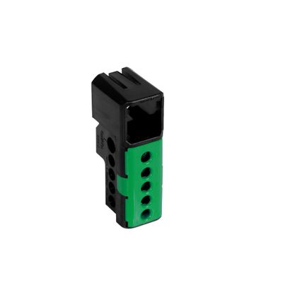Ce bornier de terre à 5 bornes, conçu par DEBFLEX, est idéal pour les coffrets de protection et les systèmes de distribution électrique.