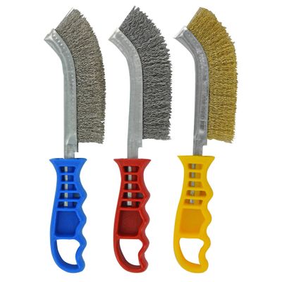Le kit comprend une brosse en acier pour un usage courant, une brosse en acier laitonné adaptée au bois et aux matériaux non ferreux, et une brosse en acier inoxydable pour un brossage intensif sur inox.