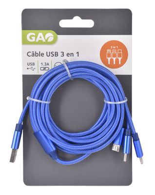 Ce câble chargeur USB nylon 3 en 1 universel 2.5 m GAO permet le chargement de téléphones portables ou de tablettes équipés d'un port USB Type C ou Micro USB ou Lightning.
