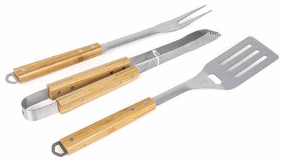 Ce coffret de 3 accessoires de cuisson pour barbecue avec manche en bambou SOMAGIC contient 1 pince 1 spatule et 1 fourchette pour barbecue.