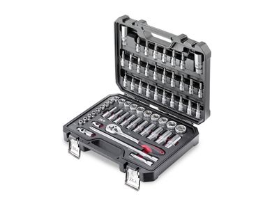 Ce coffret de douilles de 61 pièces est proposé dans un boitier en plastique robuste avec deux charnières et deux fermetures métalliques, résistant sans problème aux sollicitations les plus dures