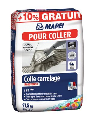 La colle carrelage rénovation sans poussière gris MAPEI contenant 25 kg de mortier est destinée à un usage aussi bien intérieur qu'extérieur. Elle couvre environ 5 m². Ce mortier colle est parfaitement adapté pour tous les types de carreaux allant jusqu'au 60 x 60 cm. Ce modèle est garanti sans poussière. Ce sac contient 10 % de mortier gratuit.