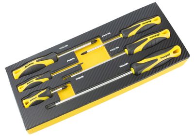 Ce module en mousse résistante et haute densité comprend six tournevis philips de différentes tailles (boule philips PH2 x 38 mm, philips PH0 x 75 mm, philips PH1 x 100 mm, philips PH2 x 100 mm, philips PH2 x 150 mm et philips PH3 x 200 mm).