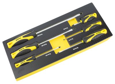 Ce module en mousse résistante et haute densité comprend six tournevis électricien & mécanicien de différentes tailles (boule à fente 6 x 38 mm, à fente 3 x 75 mm, à fente 4 x 100 mm, à fente 5,5 x 125 mm, philips PH1 x 80 mm et philips PH2 x 100 mm).