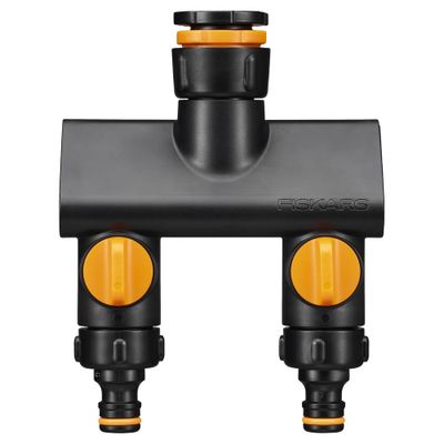 Le connecteur double Comfort FISKARS vous permet de diviser votre arrivée d'eau pour obtenir 2 sorties indépendantes. Les vannes on/off vous permettent de contrôler le débit d'eau de chaque tuyau.