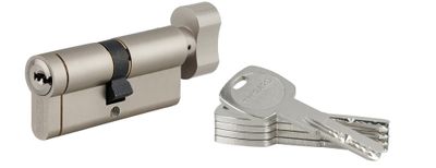 Ce cylindre de sûreté à bouton possède une entrée de clé et un bouton côté intérieur. Celui-ci peut être actionné à tout moment pour ouvrir la porte, sans avoir besoin de la clé. Ce cylindre appelé aussi barillet est principalement utilisé sur les portes intérieures. Il est aussi particulièrement recommandé quand il existe un risque d'enfermement ou d'impossibilité d'ouvrir de l'intérieur. En effet avec ce type de cylindre la clef pourra toujours ouvrir par l'extérieur.
