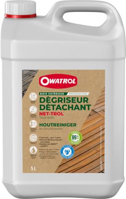 Le dégriseur - détachant tous bois NET-TROL®** de OWATROL est idéal pour dégriser et détacher le bois, et également pour nettoyer plastique, pierre, rouille sur ciment...