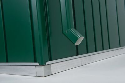 Descente d'eaux pluviales avec coudes d'évacuation et matériel de fixation pour les abris de jardin Europa Biohort.