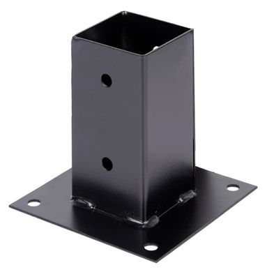Embase poteau métal galvanisé, thermo-laqué noir, pour poteau bois carré, dimensions 71 x 71 x 750 mm.