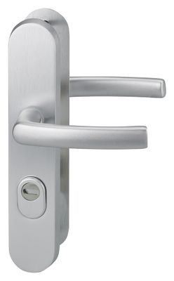 Cet ensemble de poignées de porte grise THIRARD en plaques d'aluminium massif avec double béquille et aileron en aluminium fondu sécurise votre porte d'entrée.