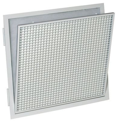 Ses mailles carrées de 15 x 15 mm permettent une reprise d'air efficace, tandis que son filtre intégré est facilement accessible grâce à une ouverture sur charnières. La grille peut être fixée par simple gravité sur les supports en T (F0) ou vissée pour une installation sur plafond staff (F1). Pratique et discrète, elle convient à tout type d'environnement.