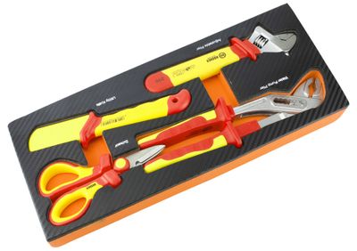 Ce module en mousse résistante et haute densité comprend quatre outils isolés VDE 1000V pour travailler en toute sécurité sur des installations électriques. Les outils inclus sont une clé à molette de 210 mm, une pince multiprise de 250 mm, un cutter à lame VDE 1000V et un ciseau d'électricien VDE 1000V. Les passes-doigts offrent une prise en main confortable. Avec ce module, vous disposez des outils nécessaires pour vos travaux électriques.