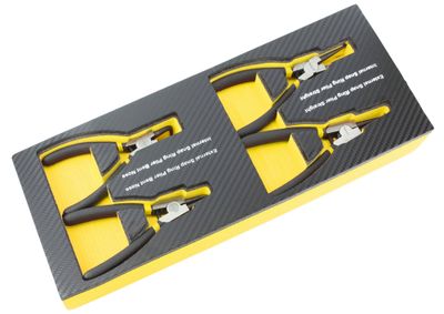 Ce module en mousse résistante et haute densité, avec une surface antidérapante, est conçu pour faciliter le stockage et l'accès aux outils. Les dimensions des pinces sont marquées pour une identification aisée. Les passes-doigts permettent une préhension confortable des pinces. Ce module comprend quatre pinces circlip Mekano essentielles pour vos travaux : une pince circlip à bec droit ouvrant, une pince circlip à bec coudé ouvrant, une pince circlip à bec droit fermant et une pince circlip à bec coudé fermant.