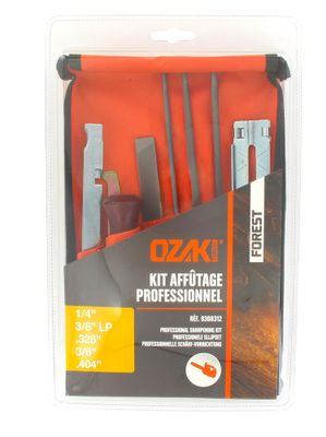 Le kit d'affûtage OZARKI contient tout ce qu'il faut pour entretenir et affûter votre chaîne de tronçonneuse. Il comprend trois limes rondes de diamètres 4, 4,8 et 5,5 mm, une lime plate, un porte-lime, une jauge de profondeur, une curette et un manche en bois.