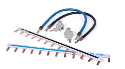 Le kit comprend 2 peignes de raccordement (un bleu et un noir), deux bornes d'alimentation et deux câbles avec embouts sertis, offrant une compatibilité avec tous les types de bornes de connexion des appareils modulaires.