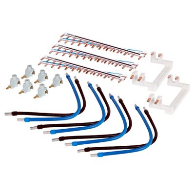 Le kit comprend six peignes de raccordement (3 bleus et 3 noirs), six bornes d'alimentation, huit câbles avec embouts sertis et deux peignes verticaux. Cet ensemble garantit une compatibilité avec tous les types de bornes à vis des appareils modulaires.