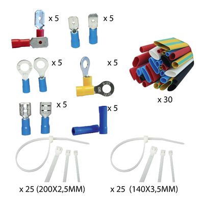 - Cosses bleues pour fils de 1,5 à 2,5 mm² : 5 cosses rondes, 5 clips mâles pré-isolés, 5 clips femelles pré-isolés, 5 manchons prolongateurs