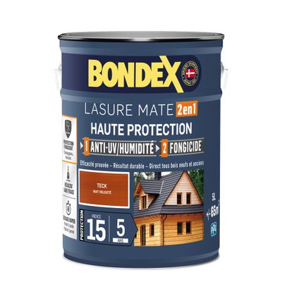 La lasure 2 en 1 haute protection teck 5 l BONDEX est idéale pour rénover, entretenir, protéger et décorer vos boiseries extérieures et verticales comme volets, fenêtres et portes extérieures, aux grandes surfaces telles que abris de jardin ou bardages...