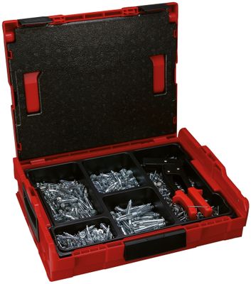 La malette de rangement spéciale corps creux est équipée de chevilles métalliques et une pince qui conviennent à de nombreuses applications : panneuax, plaque de carton platre, hourdis...