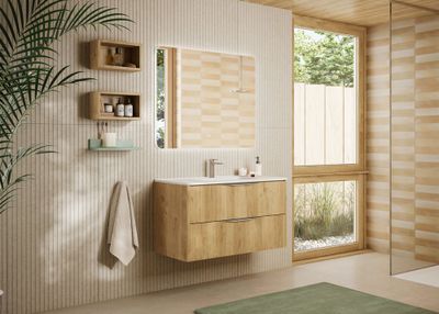Le meuble de salle de bains Mirabo séduit par son design moderne et épuré. Sa finition en mélaminé chêne naturel et ses poignées en aluminium apportent une touche contemporaine à votre salle de bains. Doté d'un plan vasque en céramique avec coins arrondis et de deux tiroirs à fermeture ralentie, il offre un rangement confortable et fonctionnel au quotidien. Format généreux 100 x 60 x 45 cm, avec vide sanitaire de 6 cm.