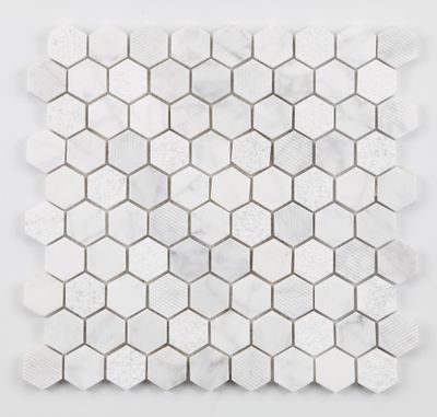 La couleur blanche du marbre permet un rendu lumineux et élégant. En ton sur ton ou pour contraster un mur plus vif, cette mosaïque hexagonale s'accordera avec les teintes froides.