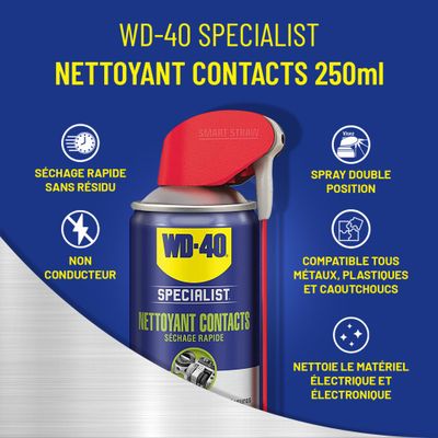 Le Nettoyant contact pro 250 ml WD-40 dissout efficacement huiles, dépôts gras, salissures, poussières, résidus de flux de soudure et condensation sur les équipements électriques ou électroniques. Sa formule non conductrice et à évaporation rapide ne laisse aucun résidu et est compatible avec tous métaux, plastiques et caoutchoucs.