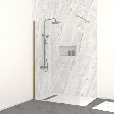 La paroi de douche Parma en finition or brossé, contemporaine et raffinée, a l'avantage de simplifier l'accès à la douche tout en rendant votre pièce plus lumineuse et spacieuse. Le profilé mural en aluminium doré brossé ajoutera une touche d'élégance à votre salle de bains.