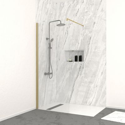 La paroi de douche Parma en finition or brossé, contemporaine et raffinée, a l'avantage de simplifier l'accès à la douche tout en rendant votre pièce plus lumineuse et spacieuse. Le profilé mural en aluminium doré brossé ajoutera une touche d'élégance à votre salle de bains.