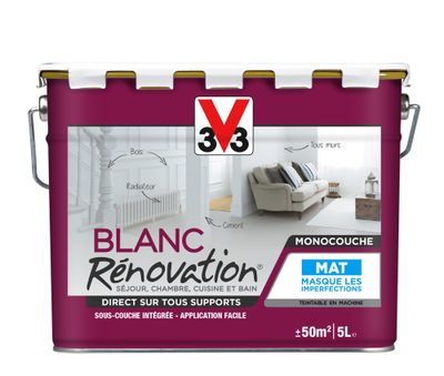 La peinture blanche monocouche Rénovation® est une solution 2 en 1 qui adhère partout à l'intérieur (couloir, séjour, salon, chambres,salles de bain....) et couvre parfaitement en une couche tous vos supports pour un résultat impeccable.