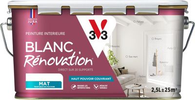 La peinture blanche monocouche Rénovation® de V33 est une solution 2 en 1 qui adhère partout à l'intérieur de votre maison (couloir, séjour, salon, chambres, etc.) et couvre parfaitement en une couche pour un résultat impeccable.