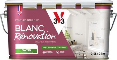 La peinture blanche monocouche Rénovation® de V33 est une solution 2 en 1 qui adhère partout à l'intérieur de votre maison (couloir, séjour, salon, chambres, etc.) et couvre parfaitement en une couche pour un résultat impeccable.