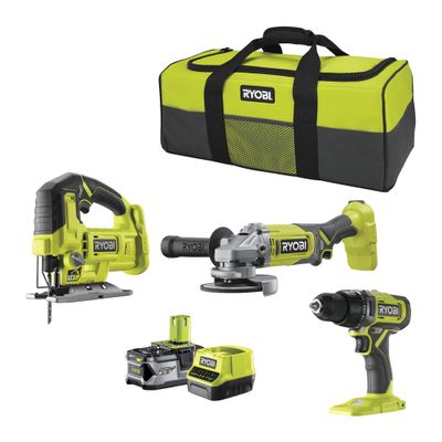 Le pack 3 outils Perceuse-visseuse - Scie sauteuse - Meuleuse d'angle 18 V ONE+ avec batteries (2,0 Ah et 4,0 Ah) et accessoires RCK183-242S - RYOBI est composé de :