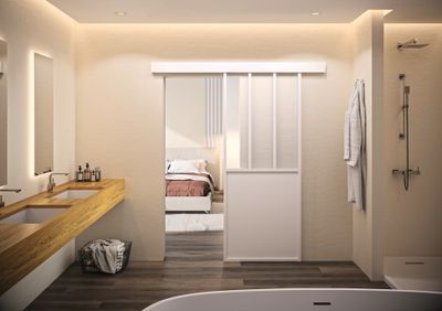 Porte d'intérieur coulissante sur rail. Elle permet de créer l'intimité entre deux pièces.