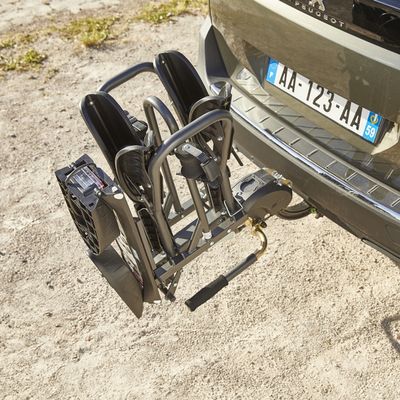 Ce modèle se distingue par sa plateforme repliable et rabattable, permettant un accès facile au coffre même lorsque les vélos sont installés. L'installation est rapide et intuitive, grâce à une poignée de serrage universelle qui assure un maintien optimal sur la boule d'attelage. Le système comprend également un rail d'accès et une gouttière de guidage facilitant la montée des vélos, ainsi qu'un blocage de roues sécurisé par sangle à cliquet. Pour plus de sécurité, le porte-vélos est équipé d'une serrure antivol intégrée, et un réceptacle est prévu pour ranger la prise 7 ou 13 pôles.