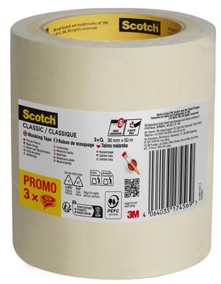 LeLot de 3 rubans de masquage Scotch Classic 50 m x 36 mm, déchirable à la main, il s'applique facilement et se retire proprement jusqu'à 2 jours après la pose. Idéal pour les travaux de peinture en intérieur.