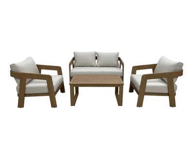Composé d'un canapé 2 places, de deux fauteuils 1 place et d'une table basse assortie, cet ensemble allie design raffiné et matériaux résistants. Sa structure en aluminium imitation bois offre un style chic et naturel, tandis que ses coussins blanc cassé apportent un confort optimal. Déhoussables et lavables, ils sont faciles à entretenir pour une utilisation durable.
